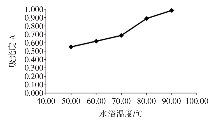 结果显示在50℃~70℃的水浴温度下吸光度变化平稳,在70℃时稳定在一个较好的吸收范围,大于70℃后,吸光度突增,反应产物发生转变,因此确定方法选用水浴温度为70℃。