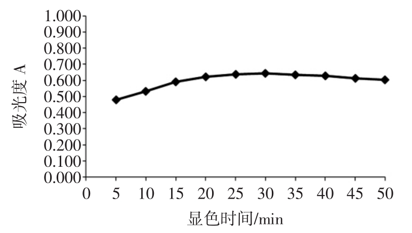 显色时间在25 min时达到最佳,确定方法选用25 min的显色时间。