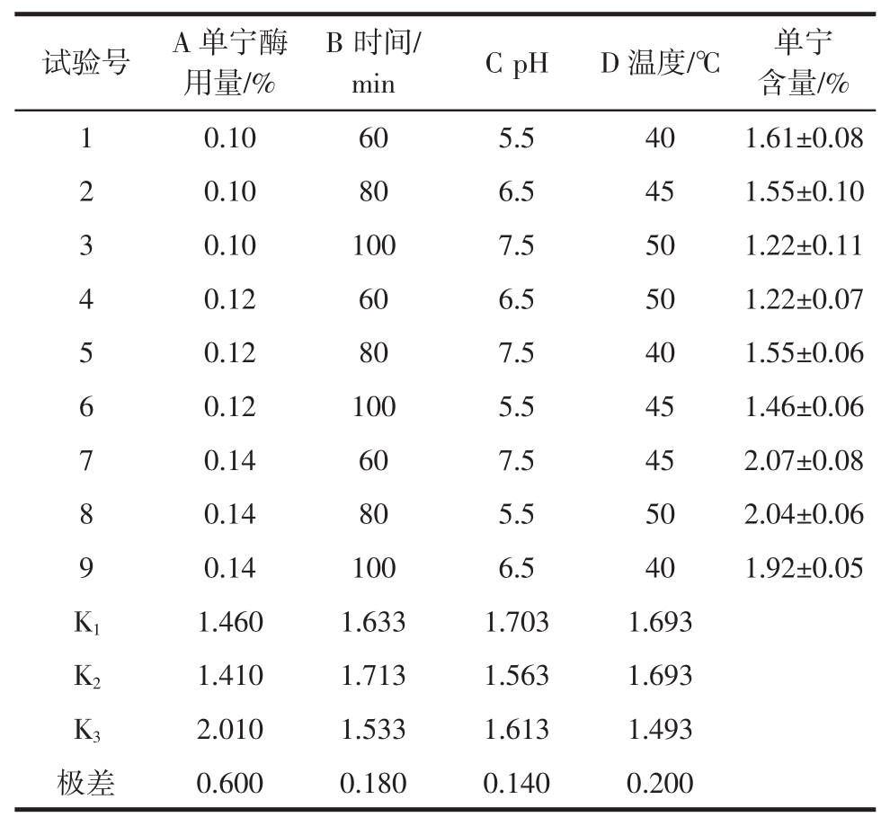 在单因素试验的基础上,选用单宁酶用量、酶作用pH、酶解温度、酶解时间四因素三水平进行正交试验,正交试验因素水平表如表1,并将试验结果进行分析,结果如表2。