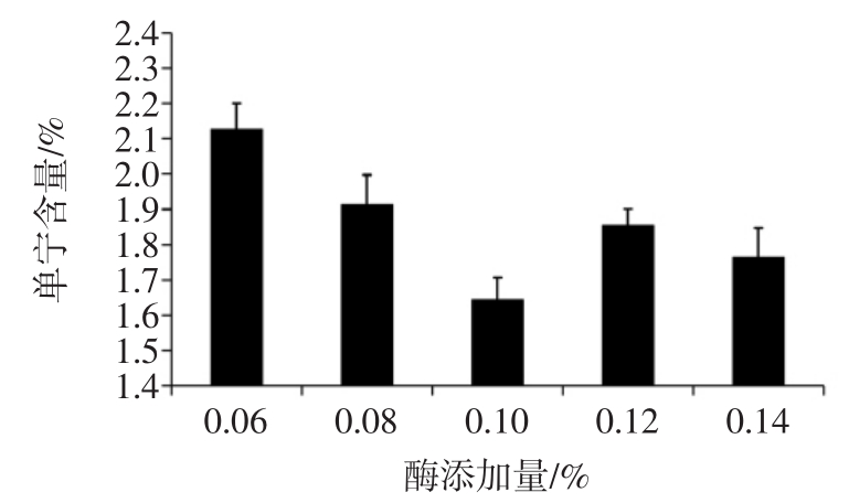 从图3可见,添加单宁酶后,有一定的单宁脱除效果(未酶解原样单宁含量为2.34%)。当用量小于0.1%时,随着酶量的增加,单宁含量逐渐减少,此时单宁酶的添加量对单宁的去除是有一定的正比影响的;当用量大于0.1%时,随着酶量的增加,单宁含量逐渐回升,此时酶的添加量对脱除单宁无较大影响。由图3的趋势可看出,在酶添加量为0.1%时,单宁含量最小,脱除率最高。因此单宁酶的最适添加量为0.1%。