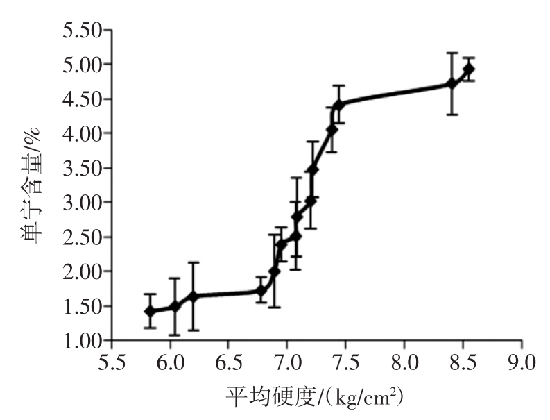 通过探讨香蕉果肉硬度与RS含量及单宁含量的关系来间接研究出成熟度与这两者之间的关系,由于测得的硬度数据有一定的跳动性,按对应的RS纯度及单宁含量与平均硬度的关系作图,得到图1、图2。