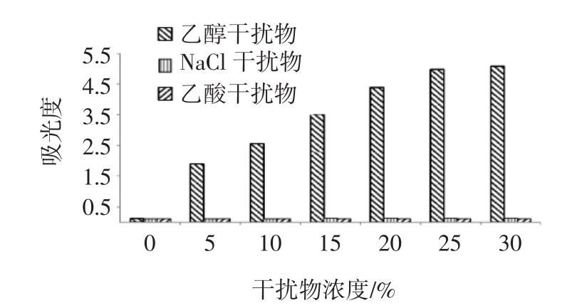 在相同还原型GSH浓度的情况下,分别添加5种不同体积分数的乙酸、无水乙醇和1 mol/mL NaCl三种物质进行干扰物试验分析(图6)。