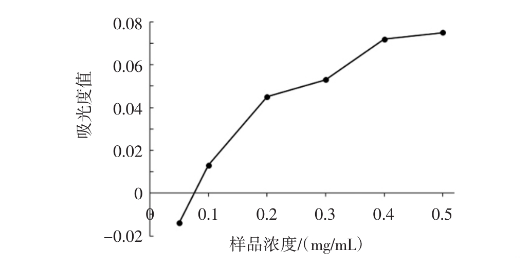 图2结果显示:较高浓度范围内,GSH浓度与吸光度值呈现线性关系,拟合线性R2=0.993 2,P<0.05,其线性回归方程:Y=0.169x+0.037;陈西娟[20]用双缩脲法测定白果多肽时,其多肽含量较大,与吸光度值呈线性关系,这与本研究相符合;但是低于0.1 mg/mL的低浓度测定时,GSH的吸光光度值与浓度线性关系不显著,R2=0.85(P>0.05),甚至出现负值,结果表明:双缩脲法不适合测定低浓度小分子多肽的含量。