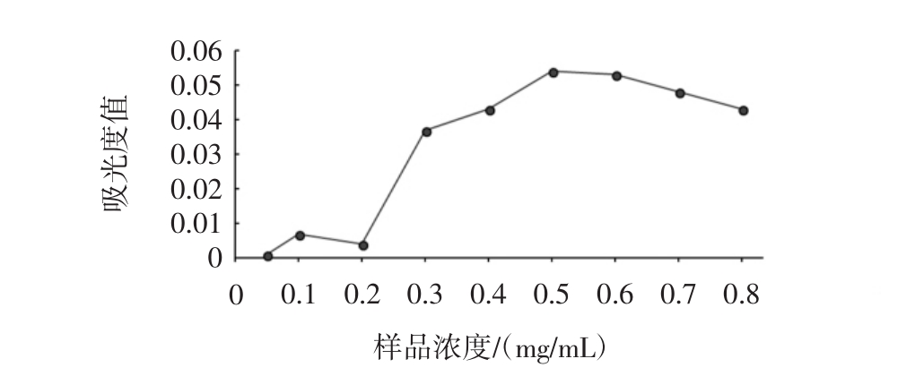 当添加不同体积分数的NaCl时,发现随着溶液中NaCl体积分数的不断增加,其吸光度值基本保持不变,表明采用紫外分光光度法测定混有不同浓度NaCl的小分子量多肽含量时,NaCl的浓度不会影响测定结果。由此可见,紫外分光光度法测定小分子多肽蛋白含量时,酸和醇类干扰物均会影响测定结果,而无机物物质对测定结果几乎无干扰作用。