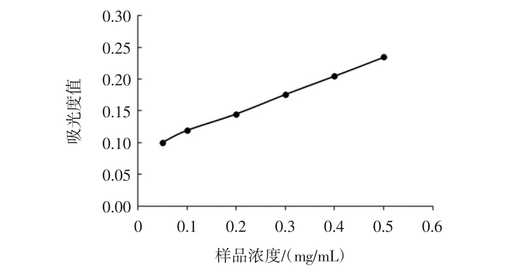标准曲线的绘制,以还原型GSH浓度为横坐标,吸光度值为纵坐标。梯度浓度分别为:0.05、0.1、0.2、0.3、0.4、0.5 mg/mL的GSH溶液,在238 nm波长下测定其吸光度值[17]。